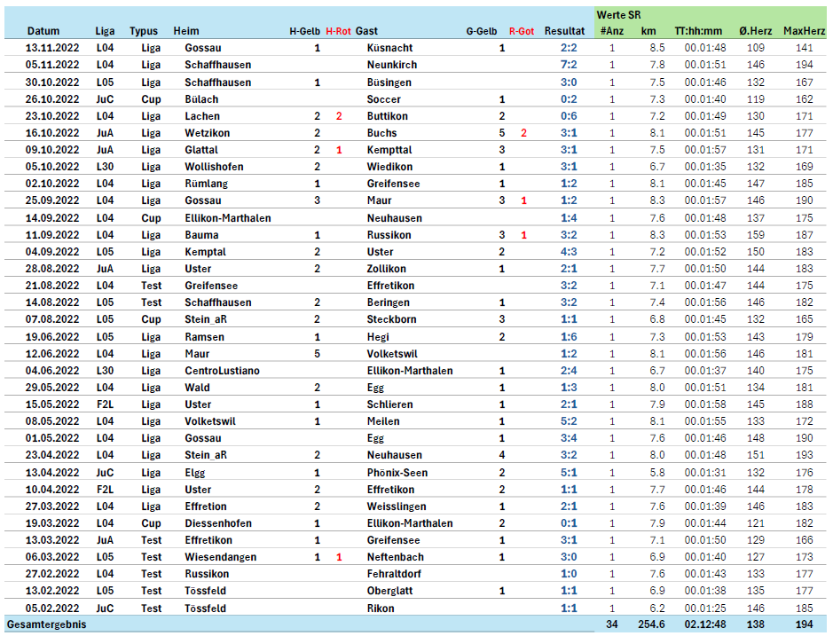 Im Jahr 2022 habe ich auch mein 500-stes Verbandsspiel geleitet. Das Jubiläum fand am 27.03.2022 beim Match Effretikon gegen Weisslingen statt. Das 4. Liga Spiel endete 2:1.
